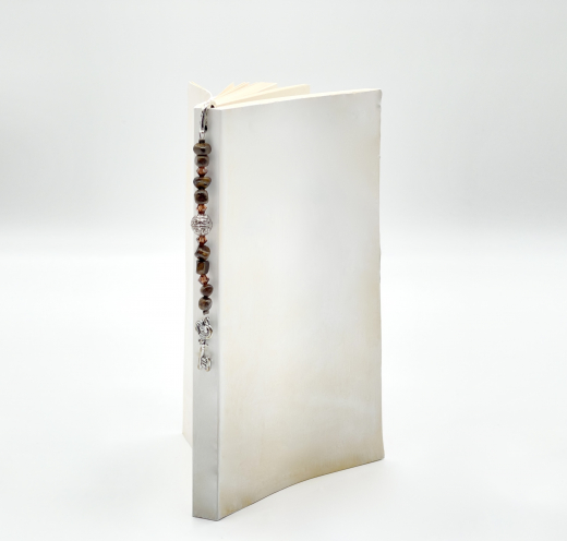 Der Metallhaken wird in das Buch, Richtung Buchrücken gelegt und markiert so Ihre Seiten.